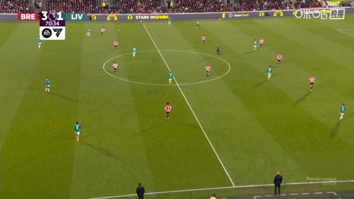 10月26日讯 利物浦vs布伦特福德第69分钟,琼斯下场,换上恩古莫哈!此时利物浦阵型也换成了424!这是要拼了!