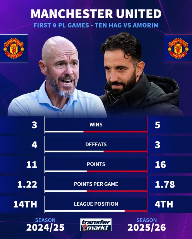 24-25赛季,滕哈赫带队:前9轮3胜2平4负,积11分,场均1.22分,联赛第14位