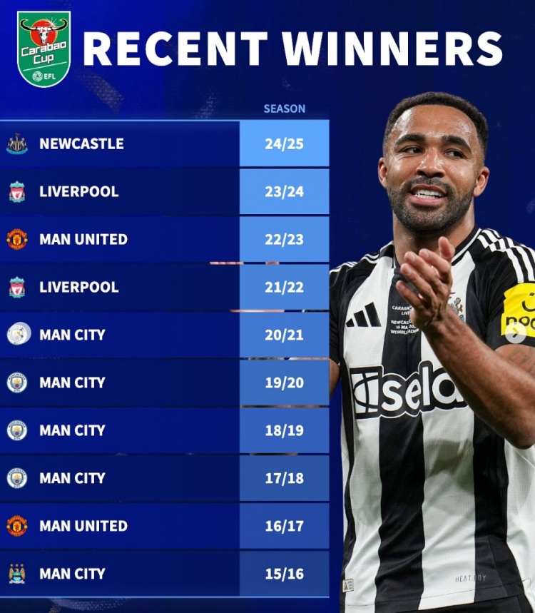 德转列近10年联赛杯冠军:曼城6年5冠+4连冠,曼联利物浦各2冠