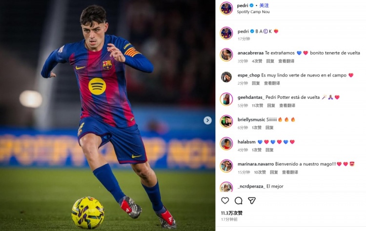 伤愈替补登场30分钟!佩德里社媒晒比赛照纪念复出:归来!