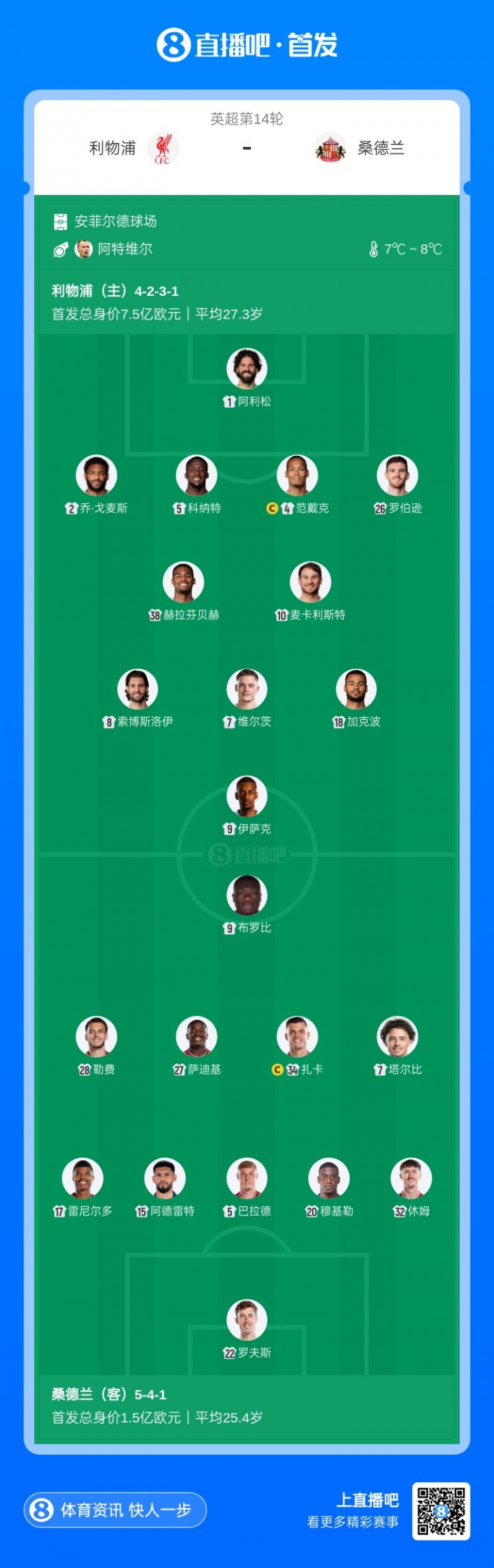 利物浦vs桑德兰首发:萨拉赫连场替补!麦8赫、维尔茨伊萨克登场